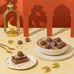 Crispy konafa and fudge cake filled with chocolate hazelnut spread, topped with crispy feuilletine & chocolate balls filled with konafa