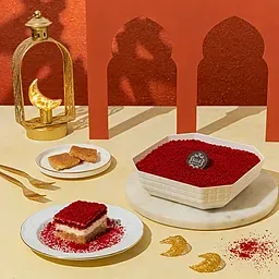 Basbousa topped with layers of cream cheese & red velvet cake