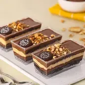 Fudge cake filled with fresh cream with caramel, chocolate hazelnut spread and decorated with biscuits