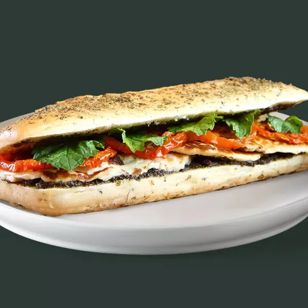 Arabian inspired Panini with an inviting filling of herbs, grilled halloumi cheese, oven roasted tomatoes and black olive tapenade