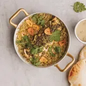Coriander chicken, freekeh mix, crispy garlic, coriander leaves and freekeh sauce