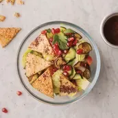 Mixed Greens, tomatoes, cucumber, radish, aubergine, pomegranate seeds and kaak crisps