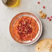 Muhammara, walnuts, pomegranate seeds and crispy shallots