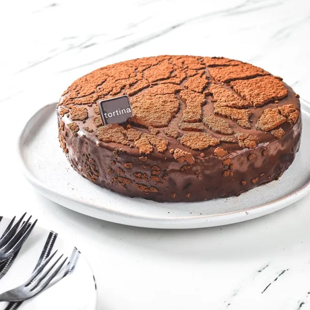 Crumble cookies base, chocolate fudge cake with cherries and milk chocolate cremeux