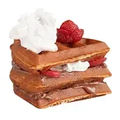 Three layers of Belgium waffles filled with Nutella, KitKat chocolate and strawberries and topped with Creme
